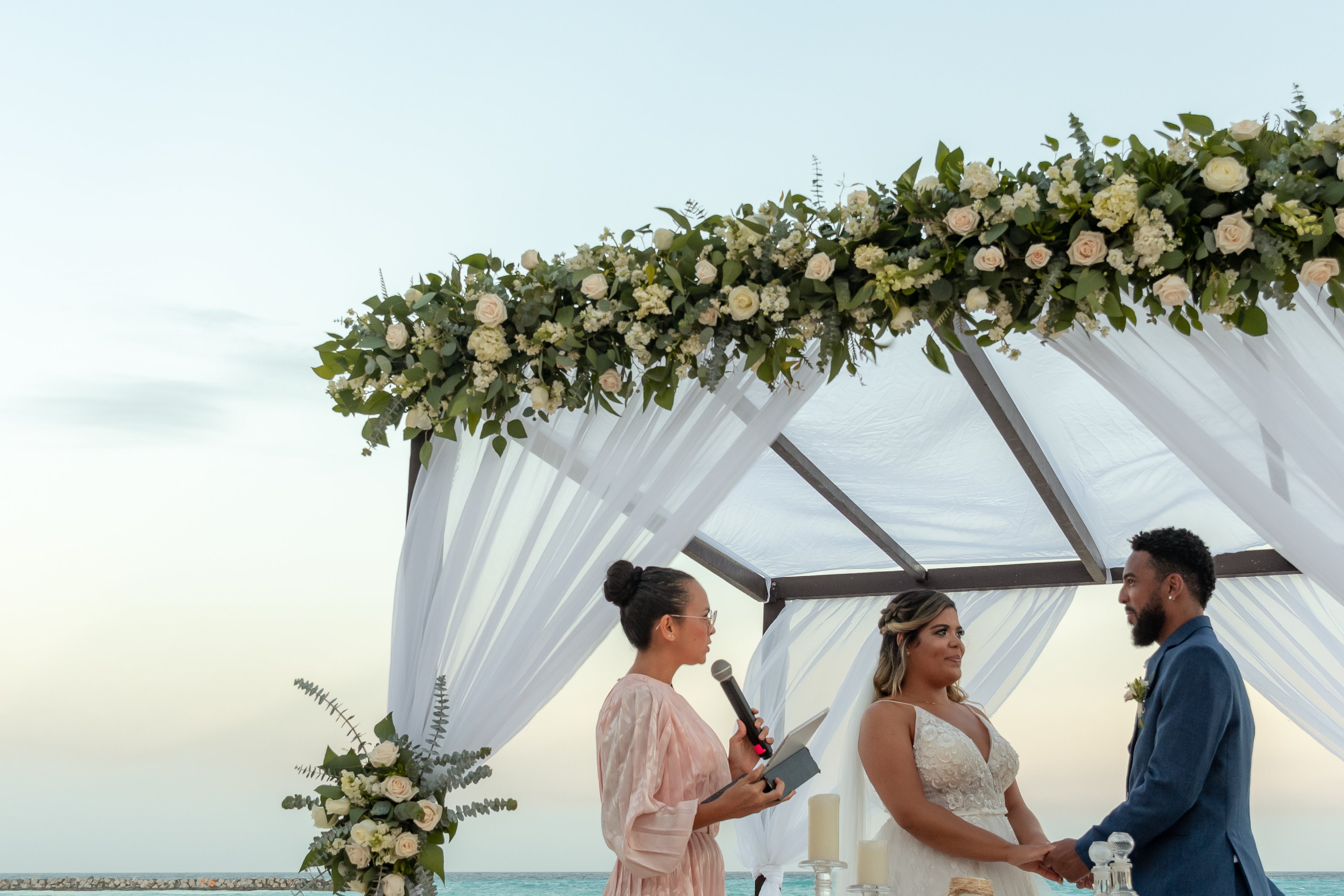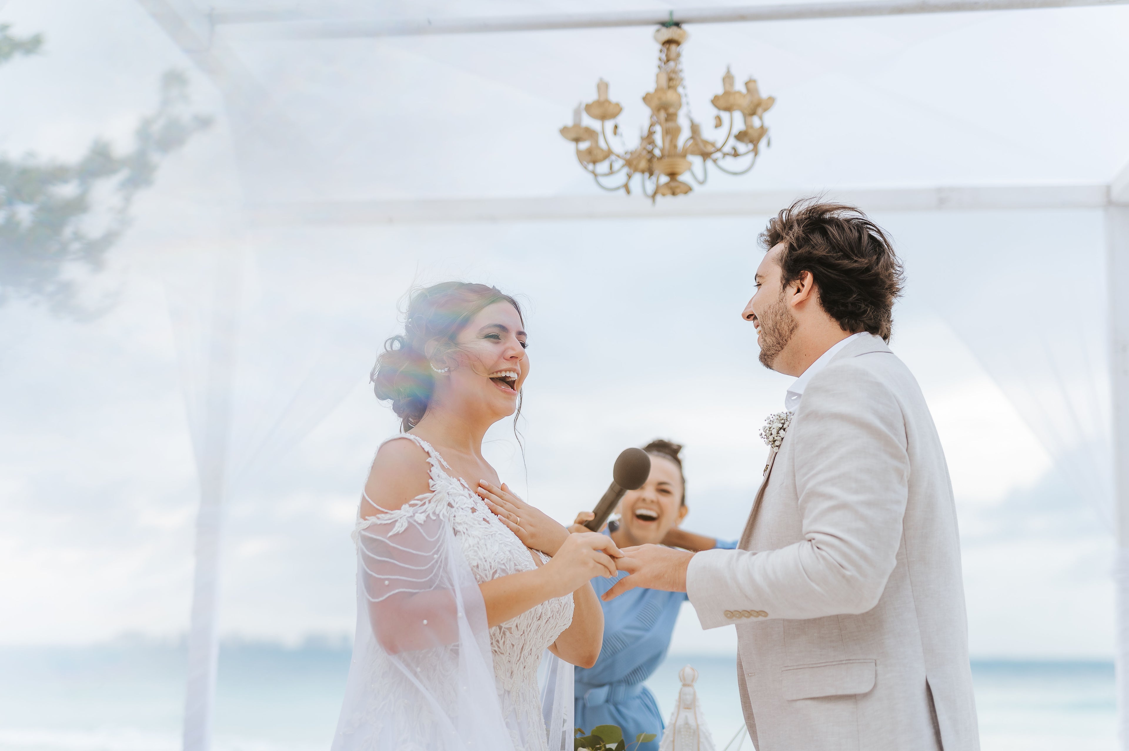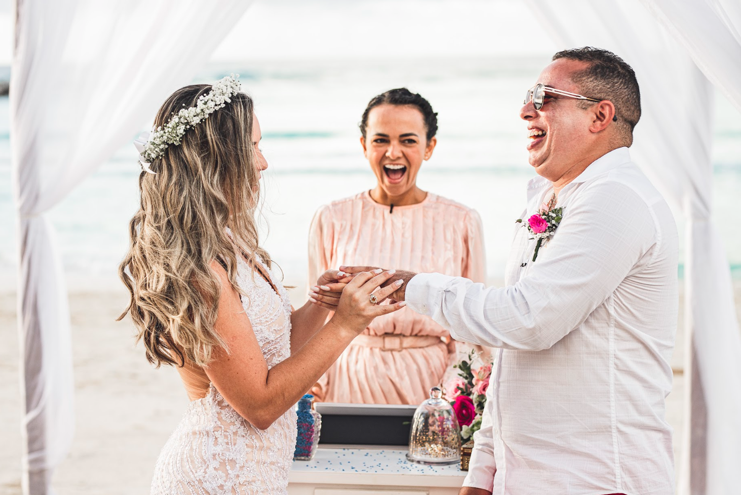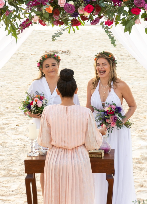"We had some tense moments before our first conversation with Nádia. We dreamed of a beach wedding in Cancun, but we didn't know what that would be like. When we first talked to her, we felt like she gave us a big hug and all the confidence we needed. She took care to make a ceremony that fit exactly with our personality, she told part of our story, said the prayers we do, brought our parents to participate, it was very emotional, very fun and BEAUTIFUL!" - JULIA & FELIPE