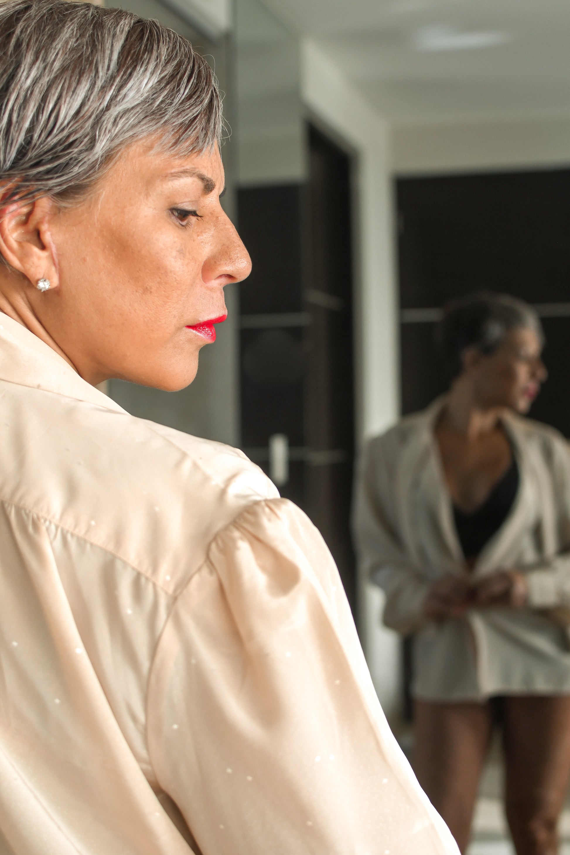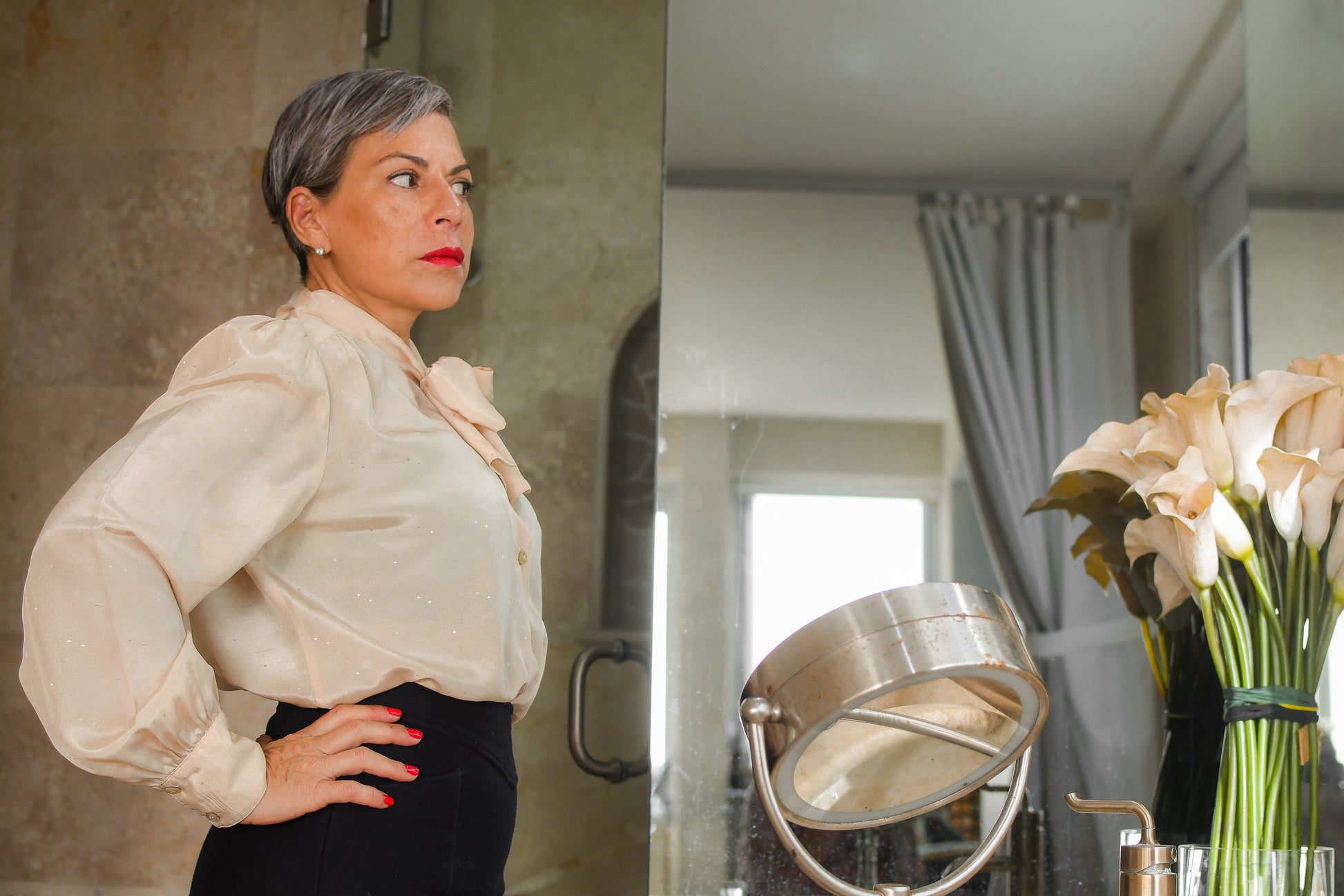 Beautiful cream-colored blouse by designer Diane Von Furstenberg. The fabric is soft and its delicate print makes me think of a constellation, it has thousands of micro dots of “star dust” and larger dots in the shape of stars. It has discreet shoulder pads and its long sleeves close with 2 buttons on each cuff.