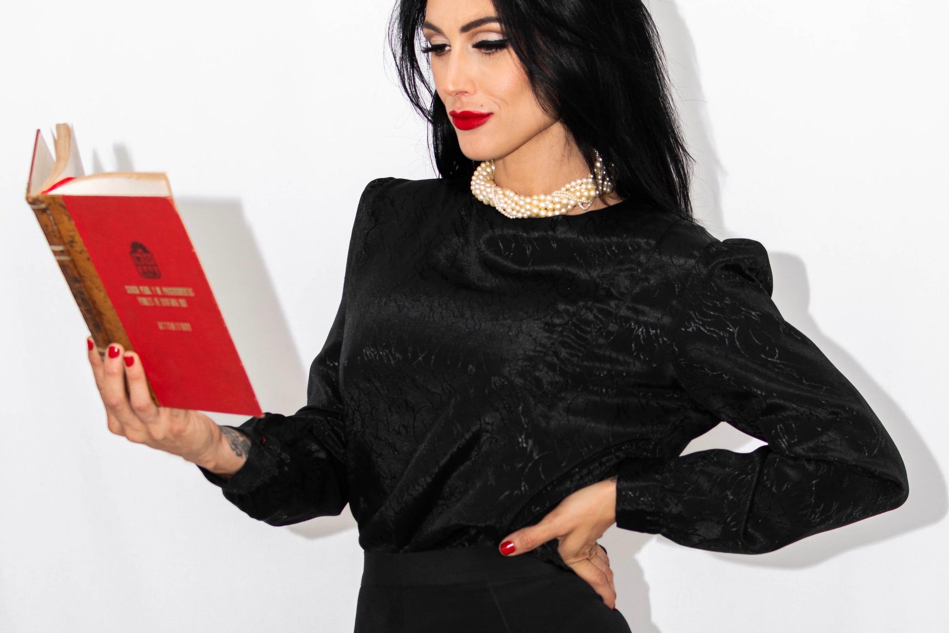 This chic 80's vintage blouse features a subtle black shiny stripe print and a decorative rectangular stripe on the left chest. Its long puff sleeves close with a button at the cuff. Perfect to pair with a mini skirt or your favorite jeans.