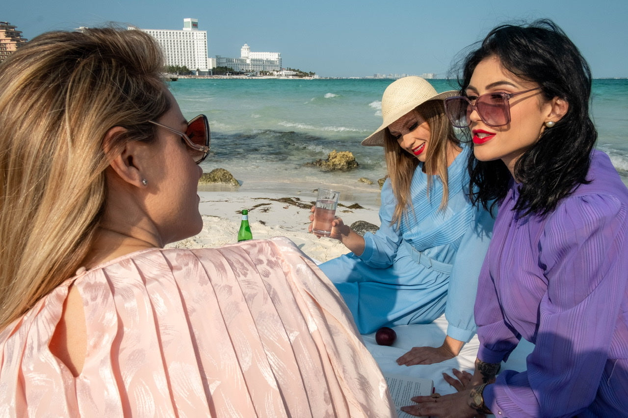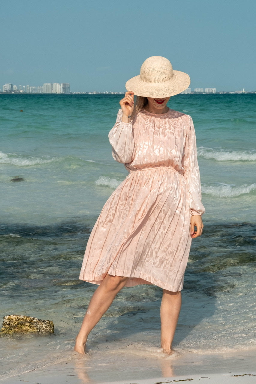 This is the ideal dress for when you need a girly touch to brighten up your day. Its print is reminiscent of brush marks in the same pale pink color spread over its surface, very bright and pretty. The fabric is washable, easy to wear made of polyester that will travel well. The cut is a classic little secretary dress from the 1970s. The entire dress has pleats, the top is cut simple with an elegant round neckline. It has a beautiful belt in the same fabric to adjust at the waist (our model was pregnant and couldn't close it, details of the belt in the last photos). The sleeves are long and it also has pleats. The skirt has some fullness and flares out accurately when you move.