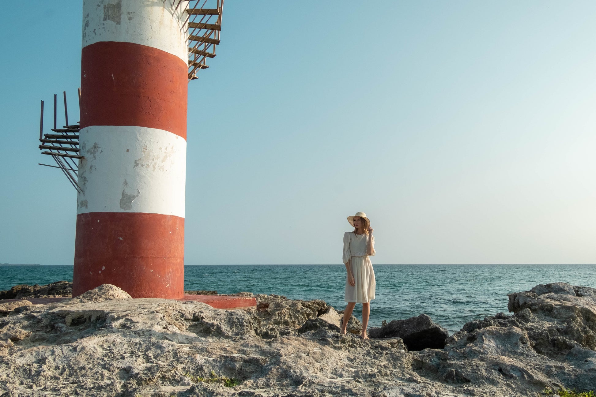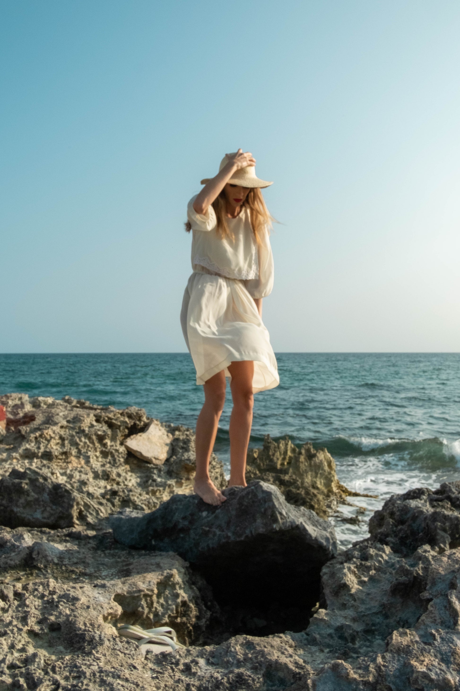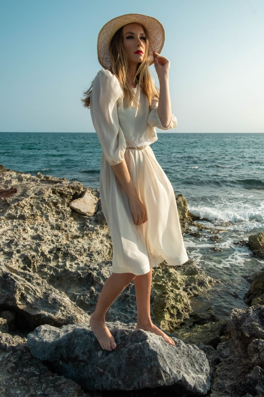 Vintage cream-coloured dress from the 70s with a round neck. Elasticated waist with a ribbon to adjust with a bow. The absence of lining creates a slight transparency that complements the romantic style of the dress.