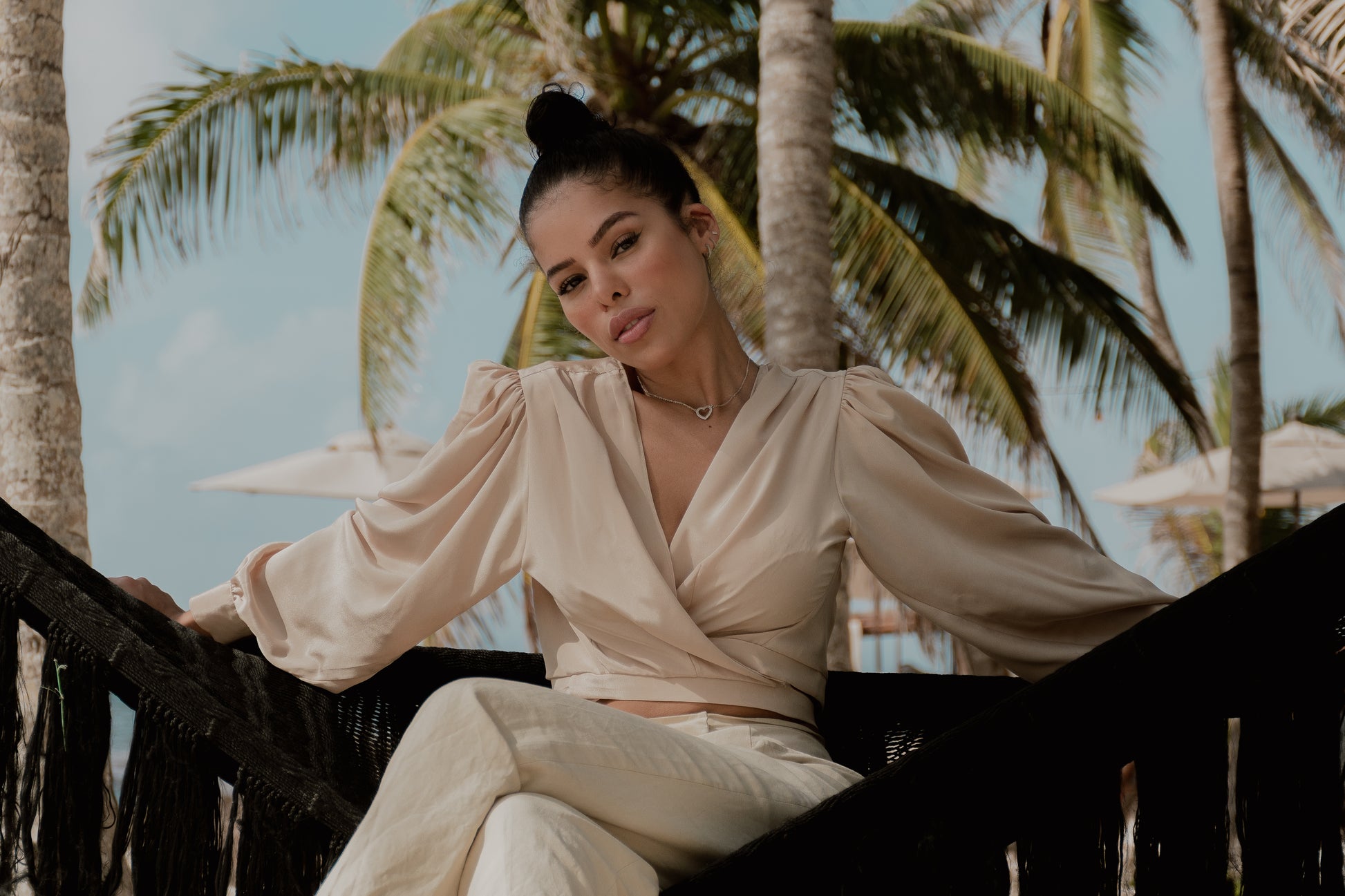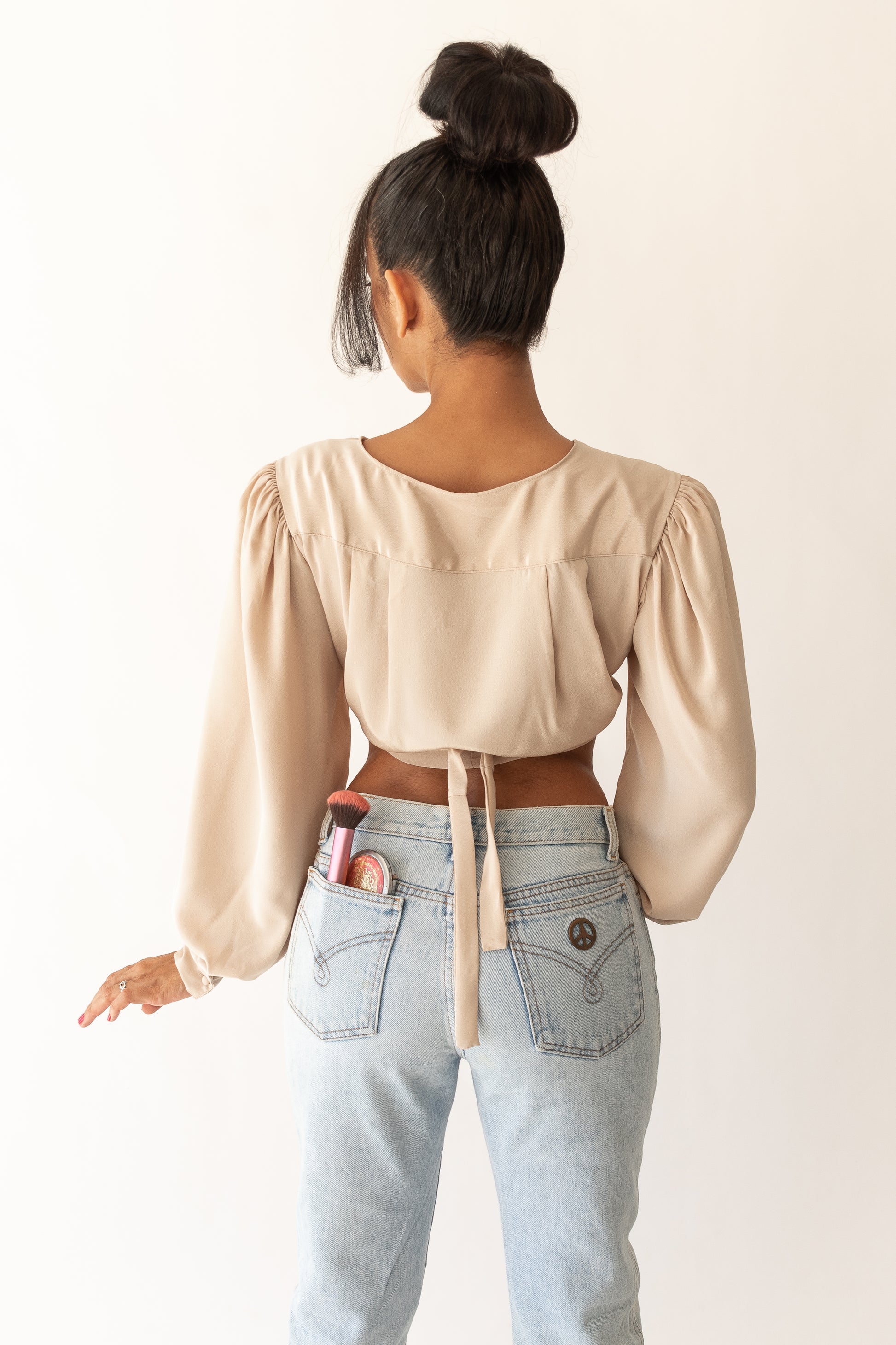 Features a V-neckline, relaxed, cropped silhouette, bow tie closure at the back, puff sleeves and fitted cuffs.