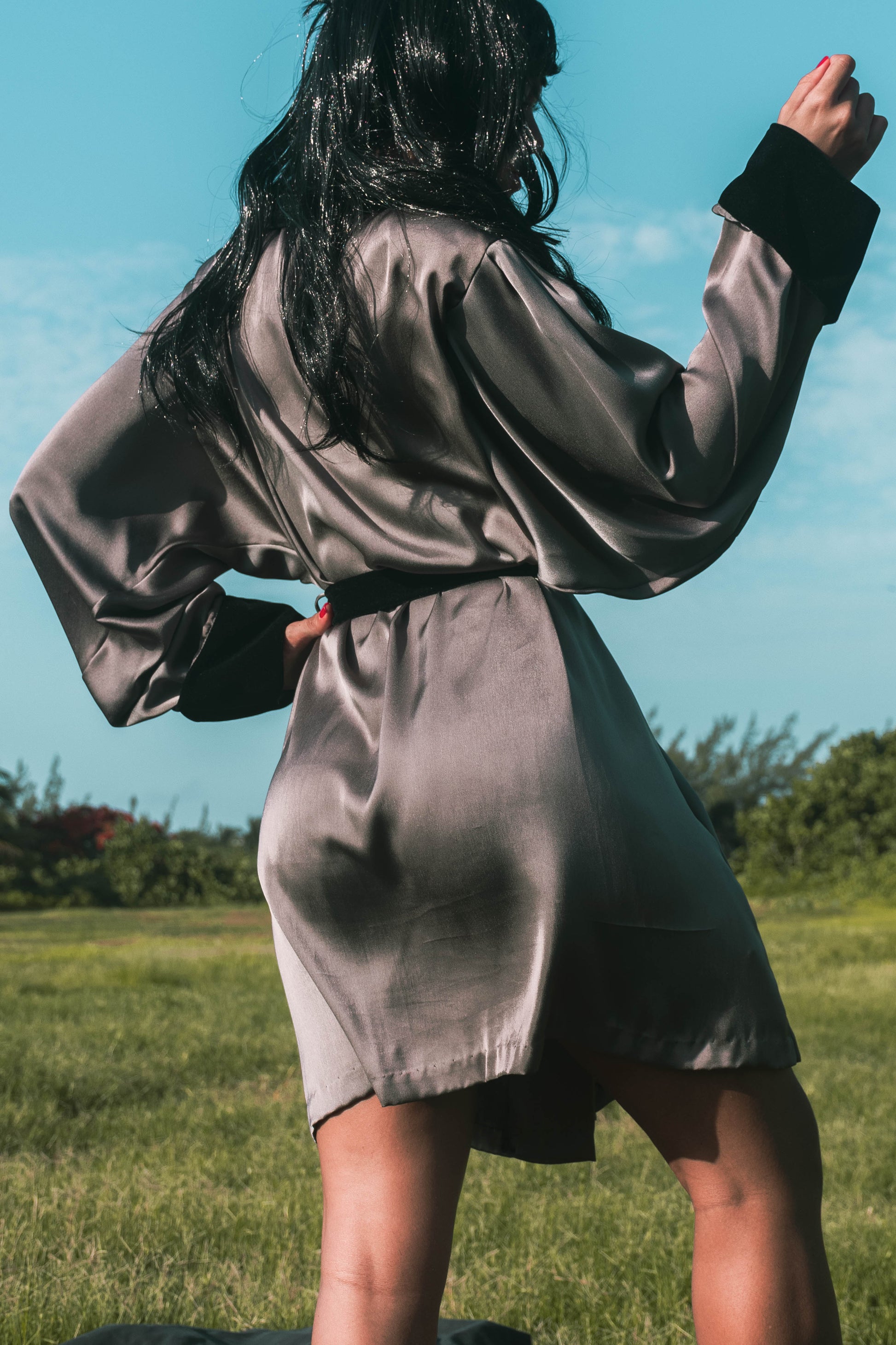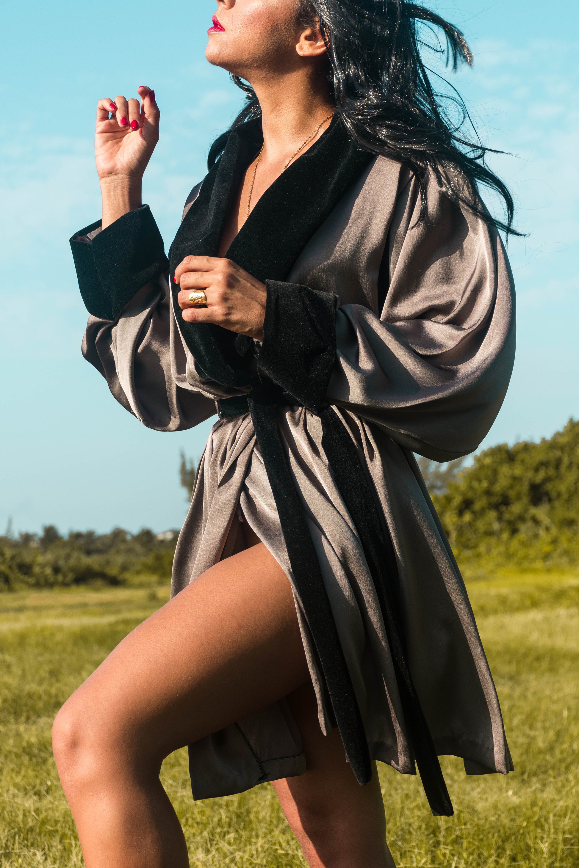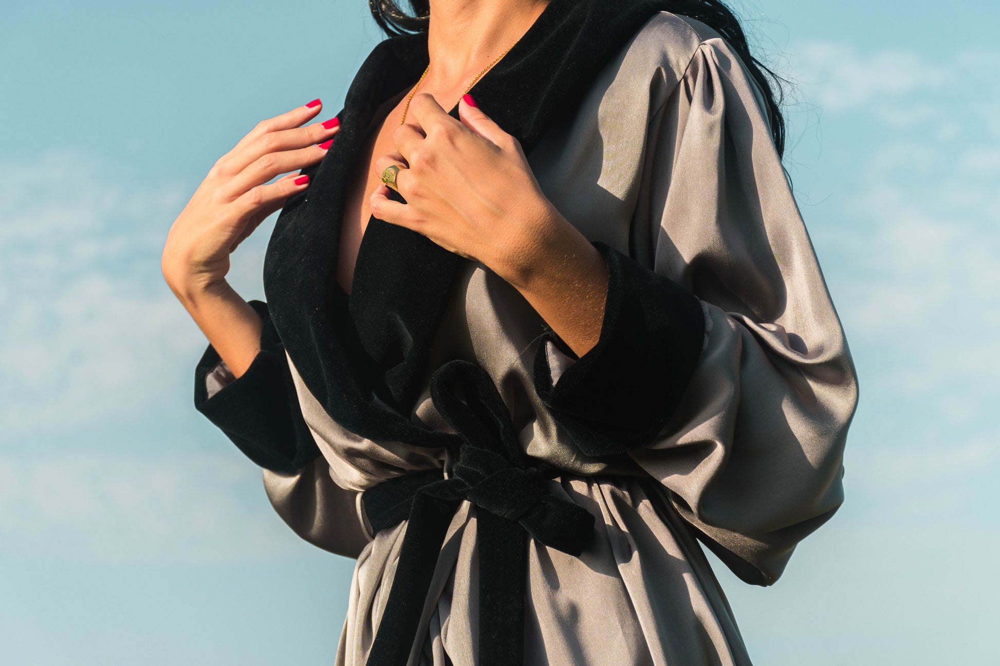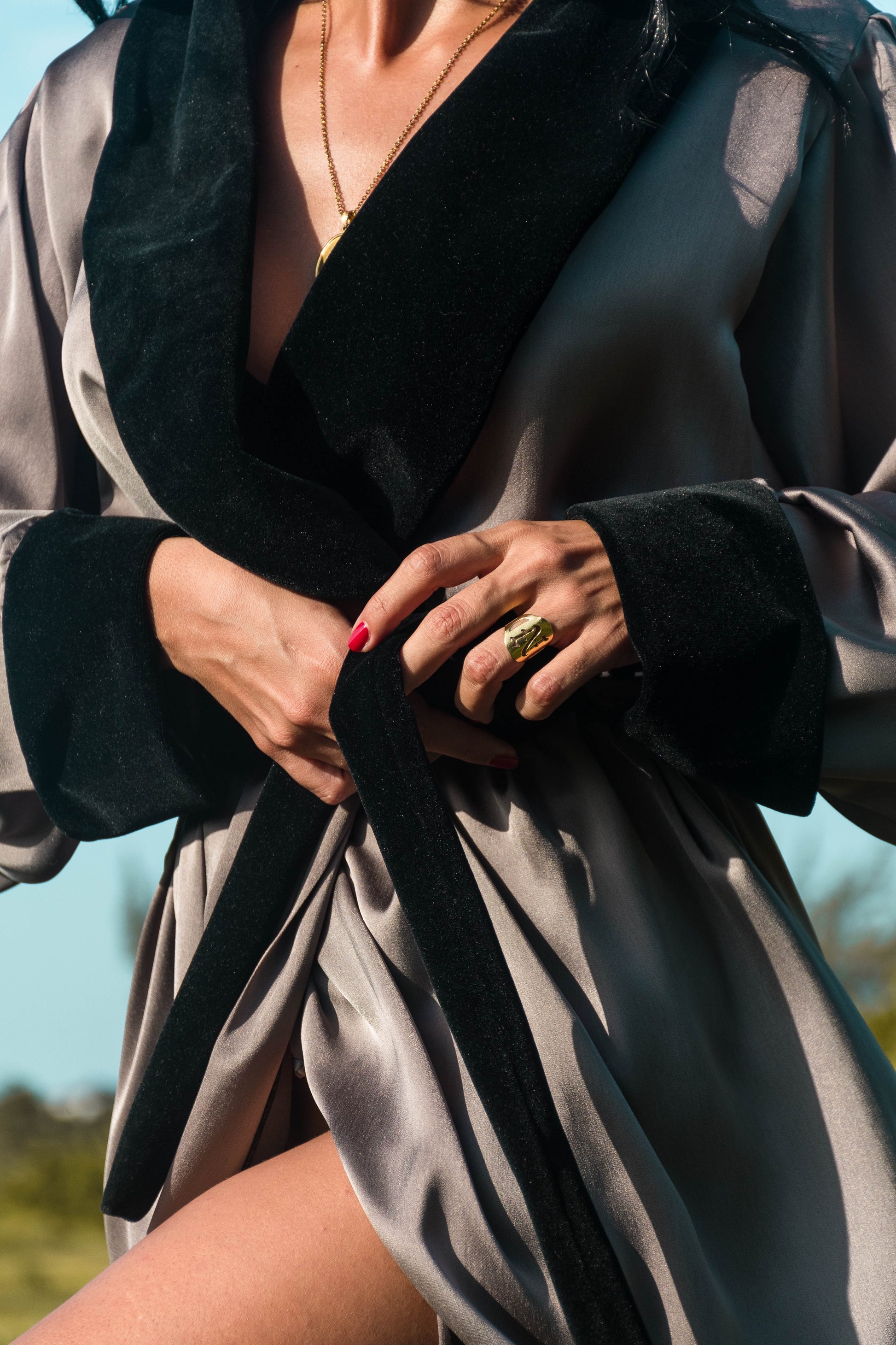 Elegant 70s-80s tunic has a silky texture, side pockets and small shoulder pads give it a very classic touch, you will feel like a celebrity wearing it. It is made of grey polyester, has an absolutely beautiful black velvet lapel and cuffs. Similar style wrapped with inner straps at the side waist and accompanied by a matching black velvet belt.