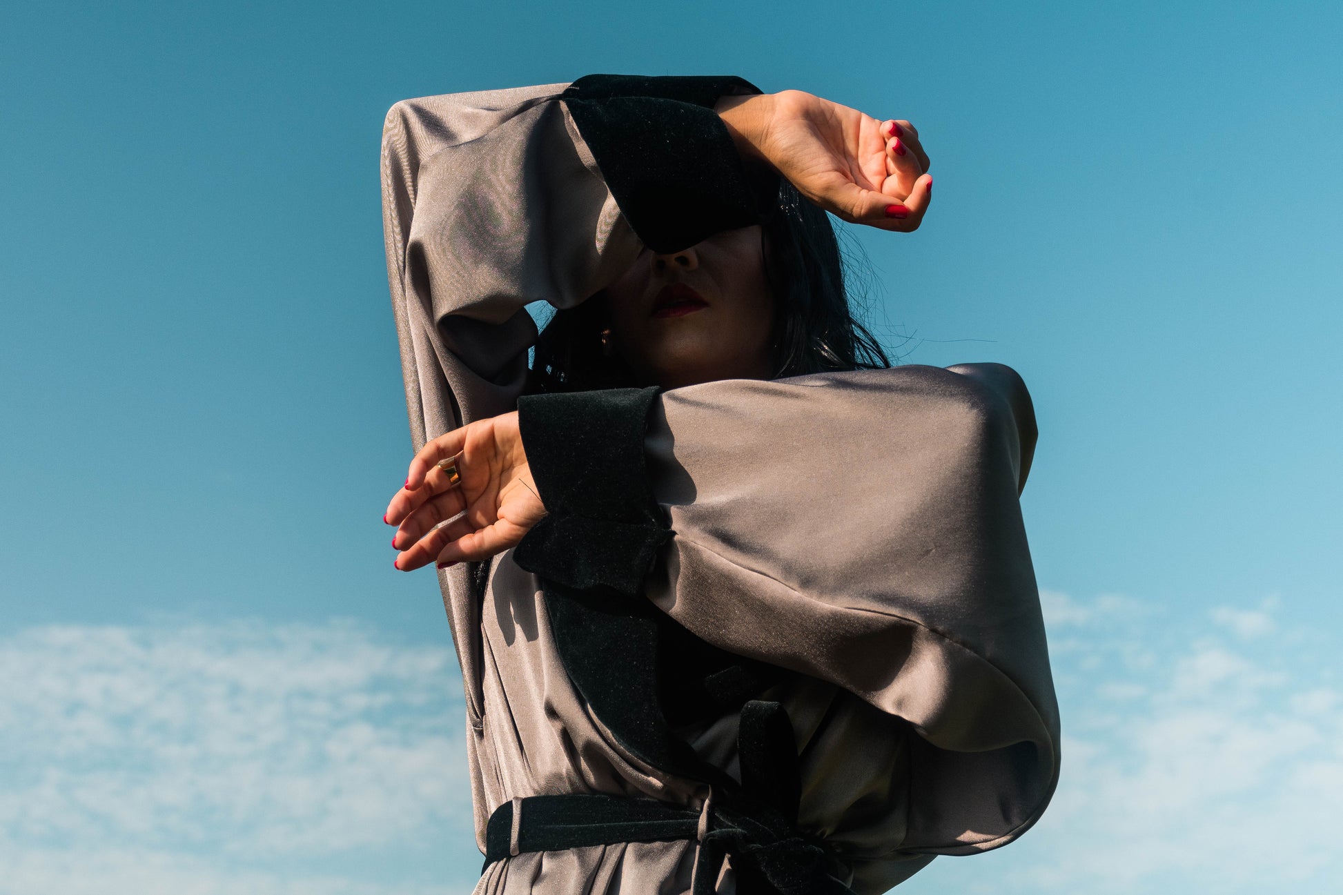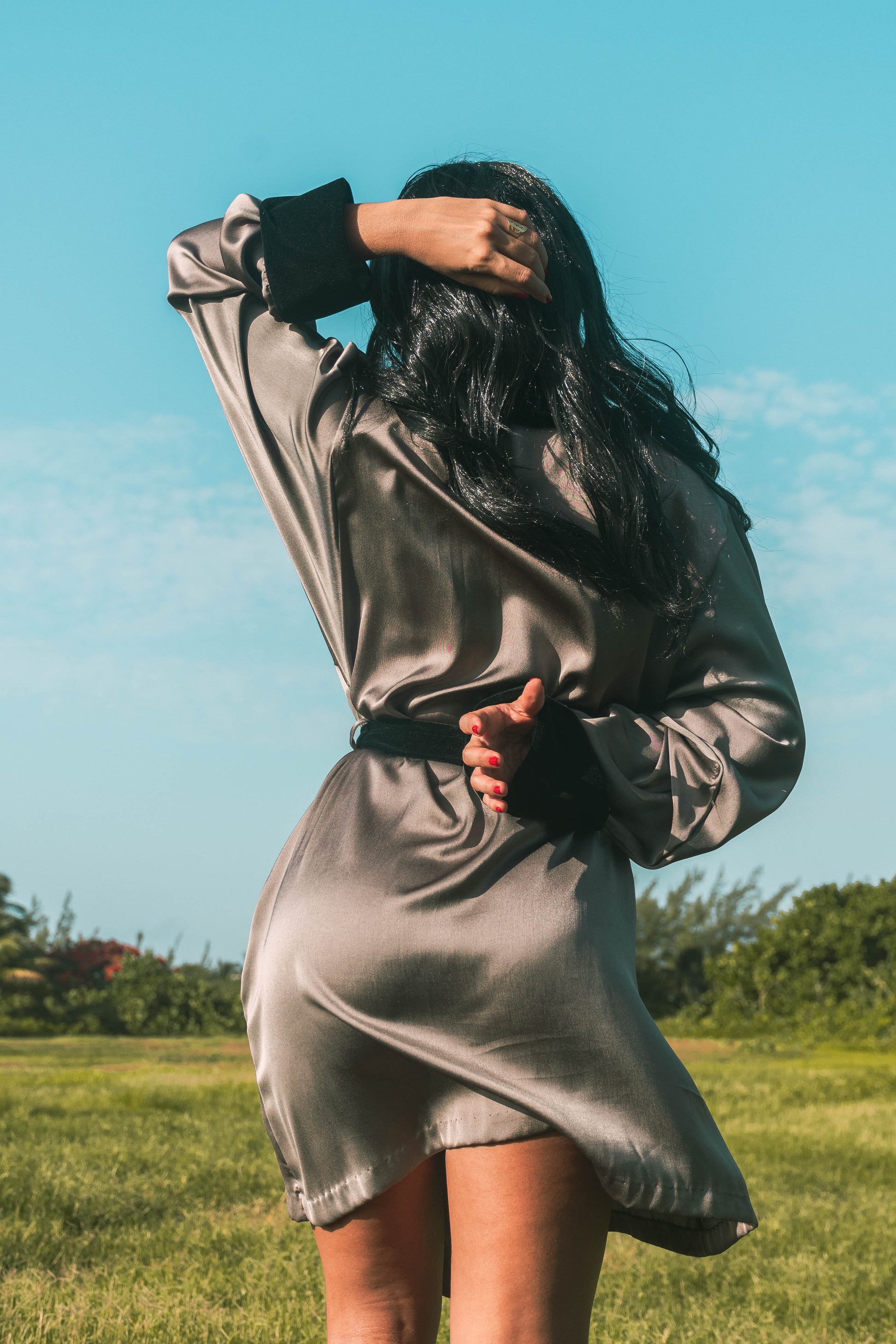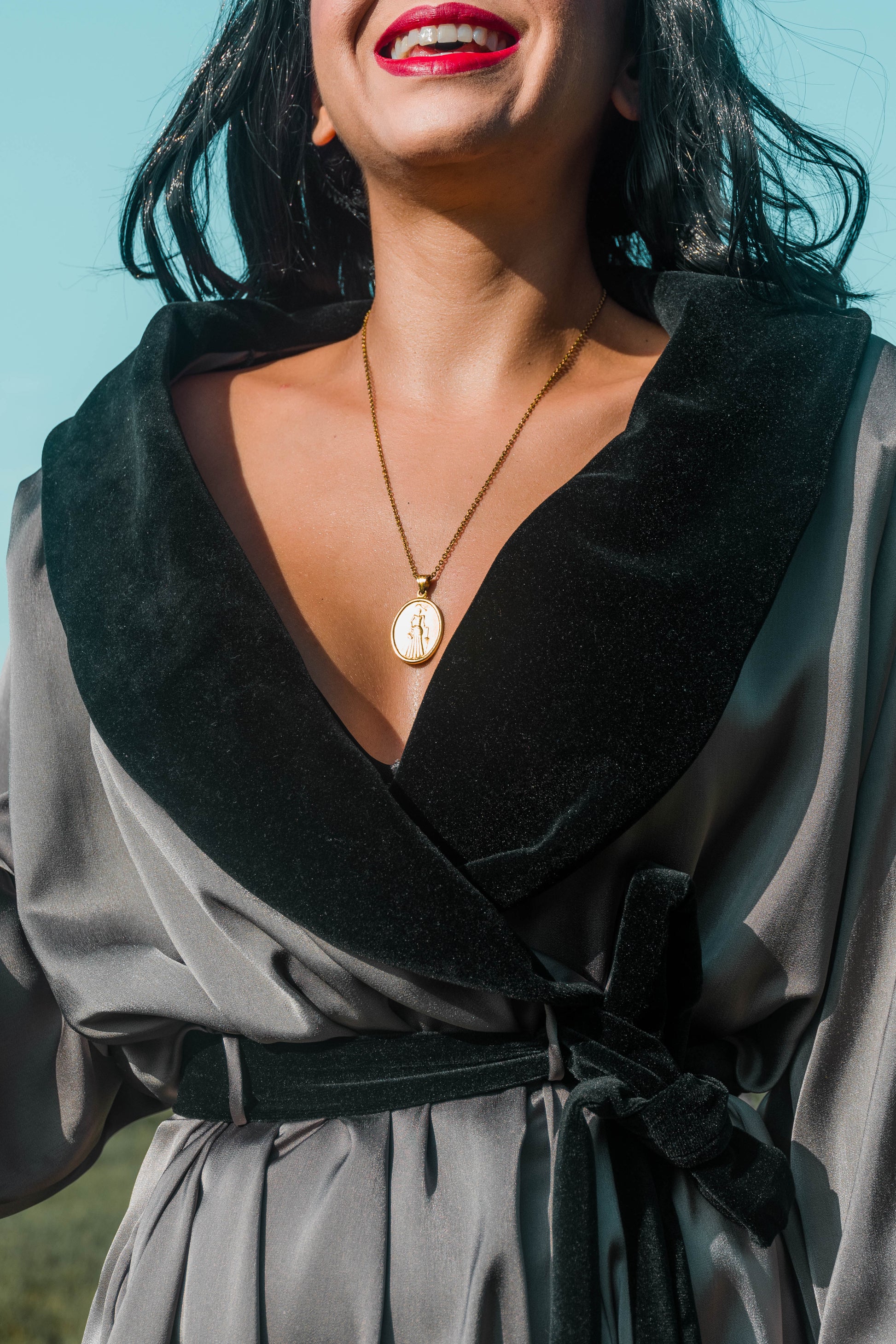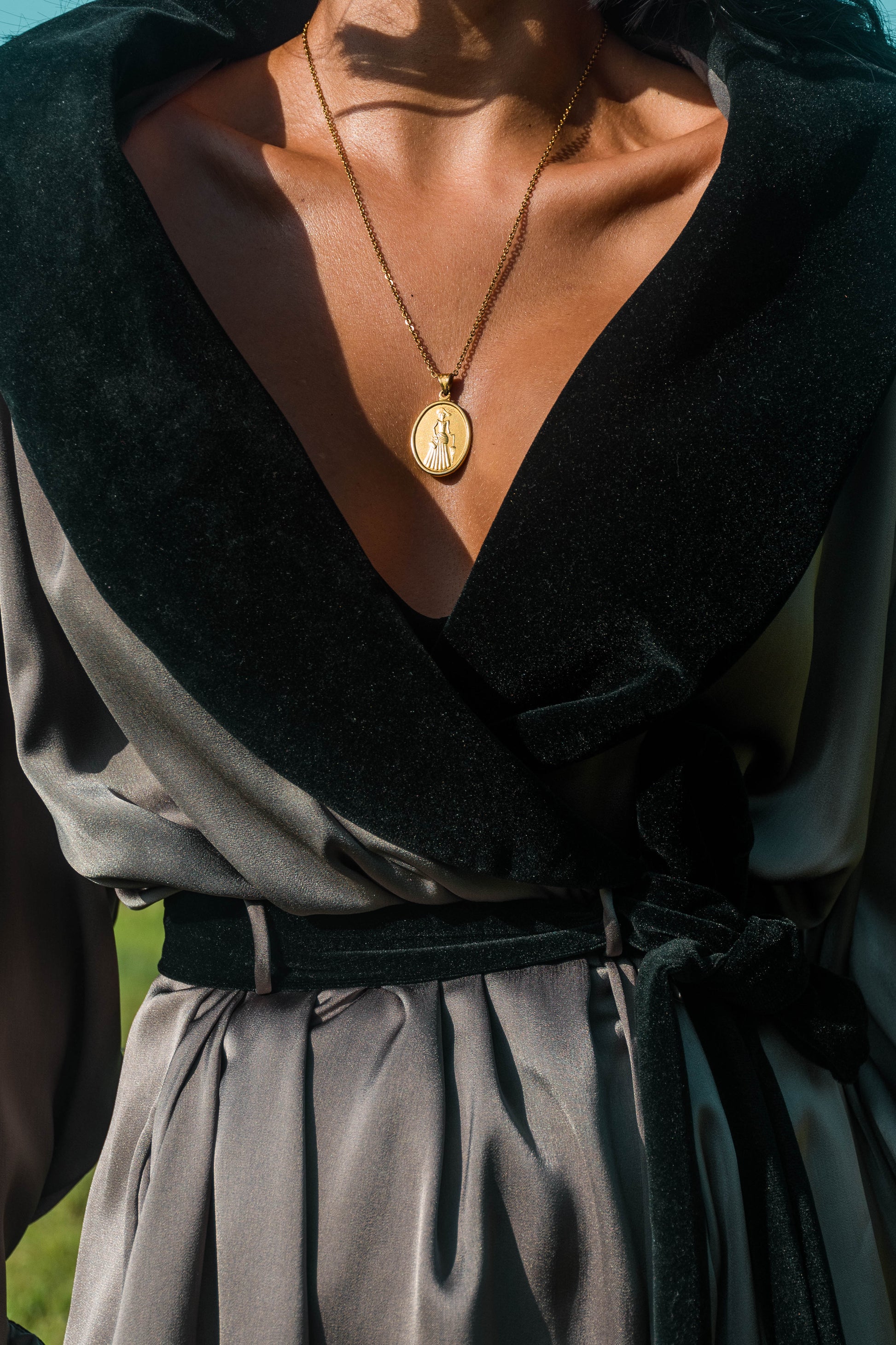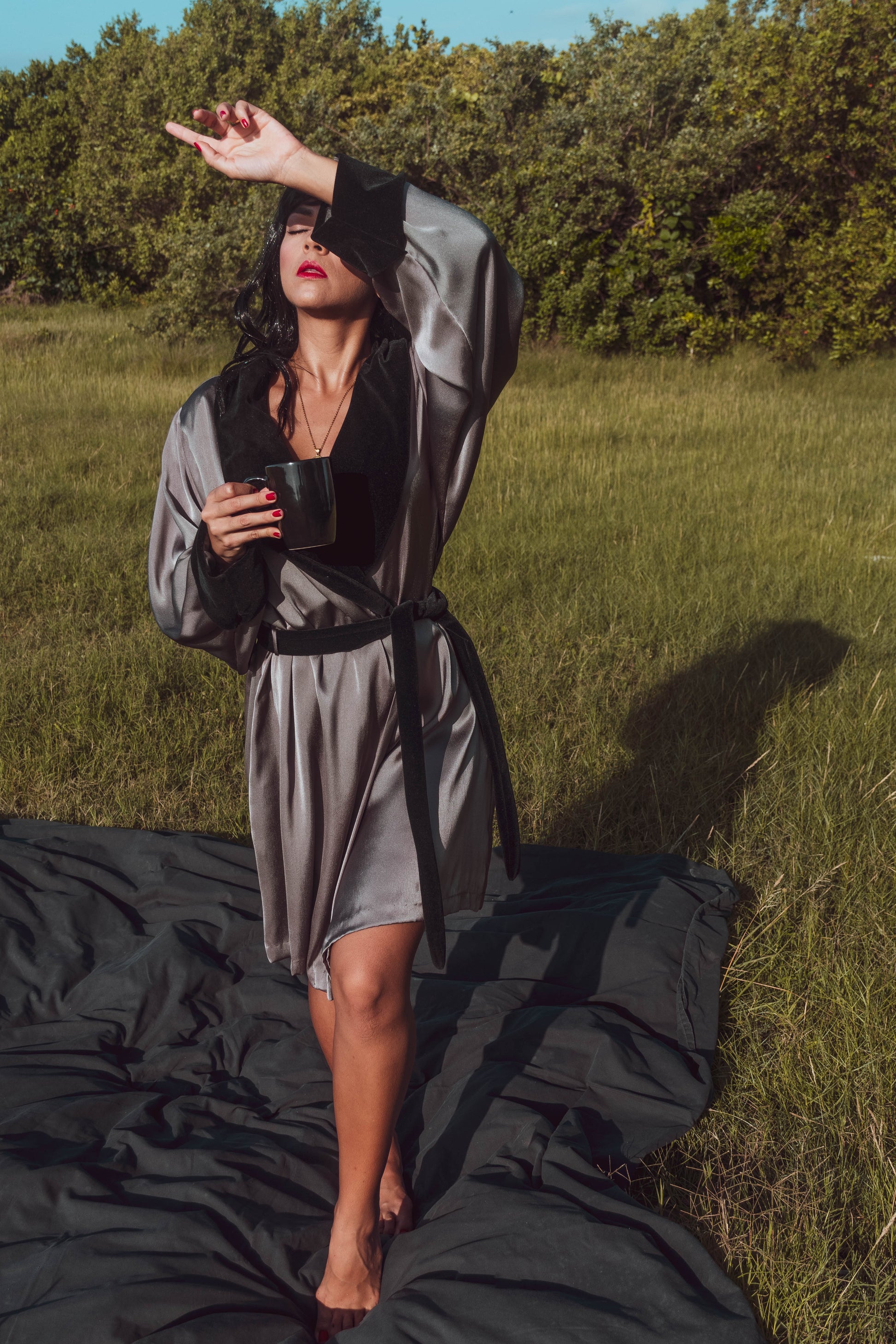 Elegant 70s-80s tunic has a silky texture, side pockets and small shoulder pads give it a very classic touch, you will feel like a celebrity wearing it. It is made of grey polyester, has an absolutely beautiful black velvet lapel and cuffs. Similar style wrapped with inner straps at the side waist and accompanied by a matching black velvet belt.