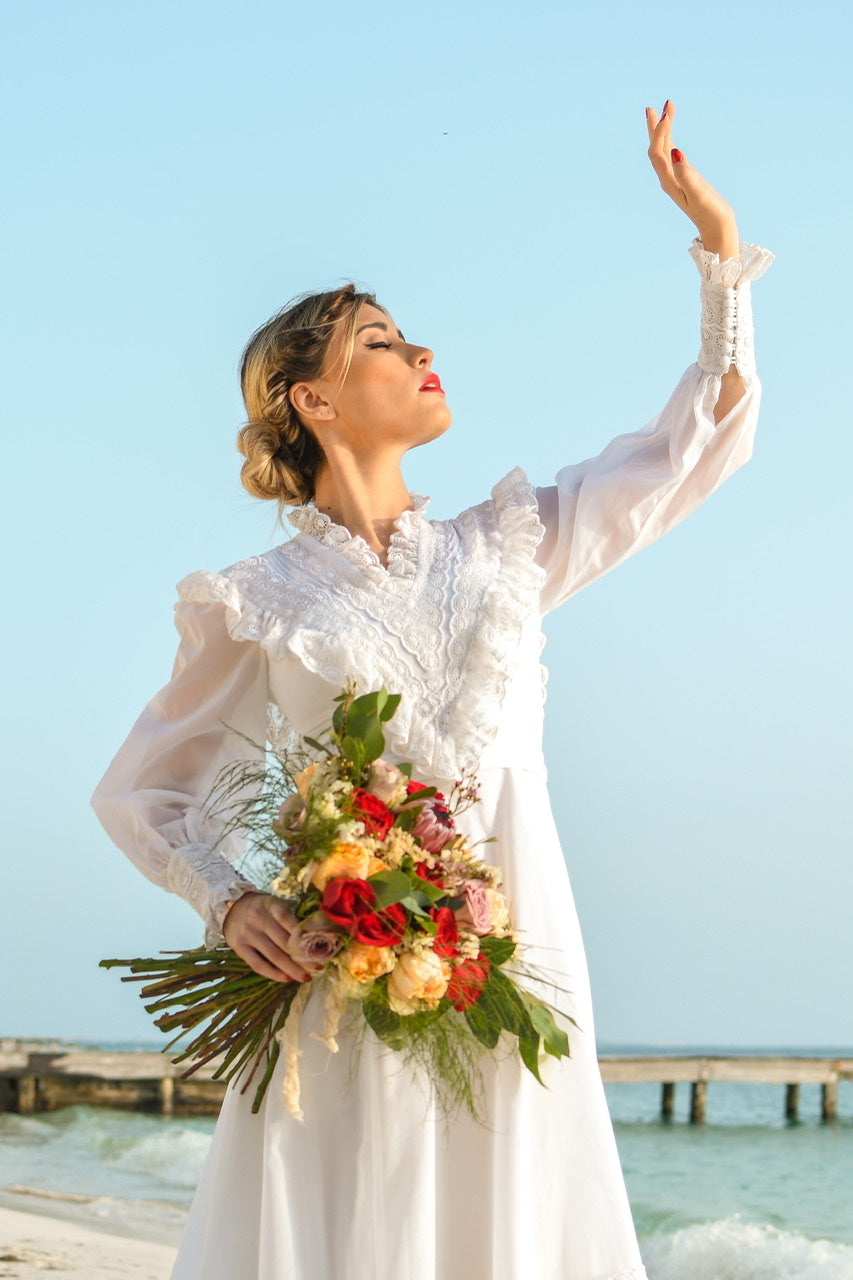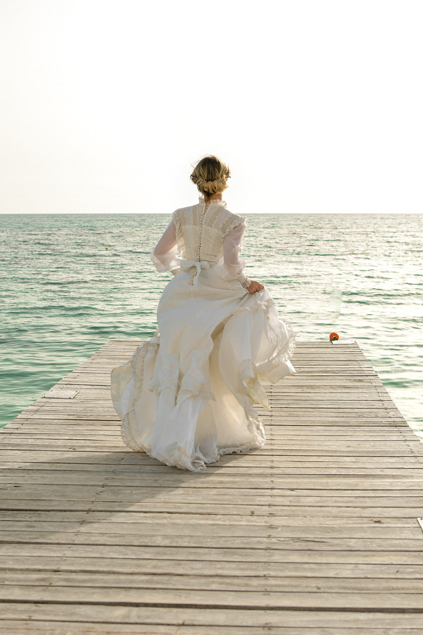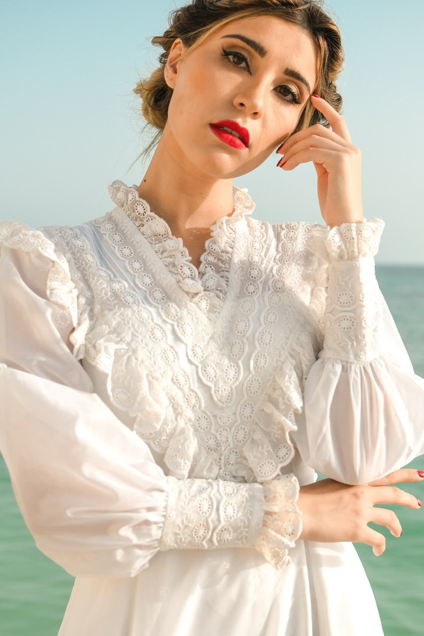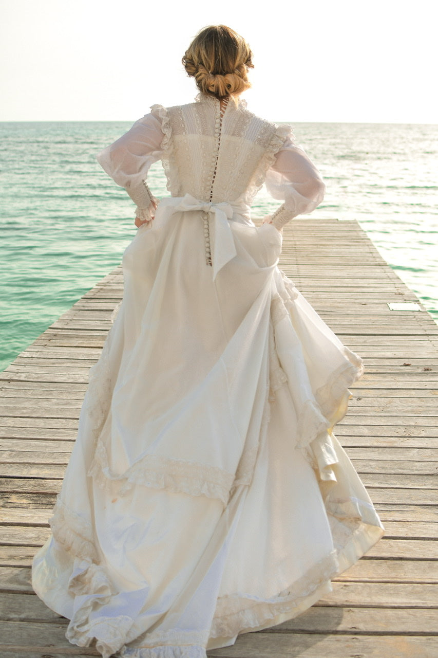 Vintage wedding dress from the early 70s, handmade in a soft ecru cream color. It features dramatic Juliette sleeves with extra-long fitted cuffs, a V-neckline with sheer fabric and a strapless bottom. It has a long ribbon at the waist (XS) to tie a bow at the back.
