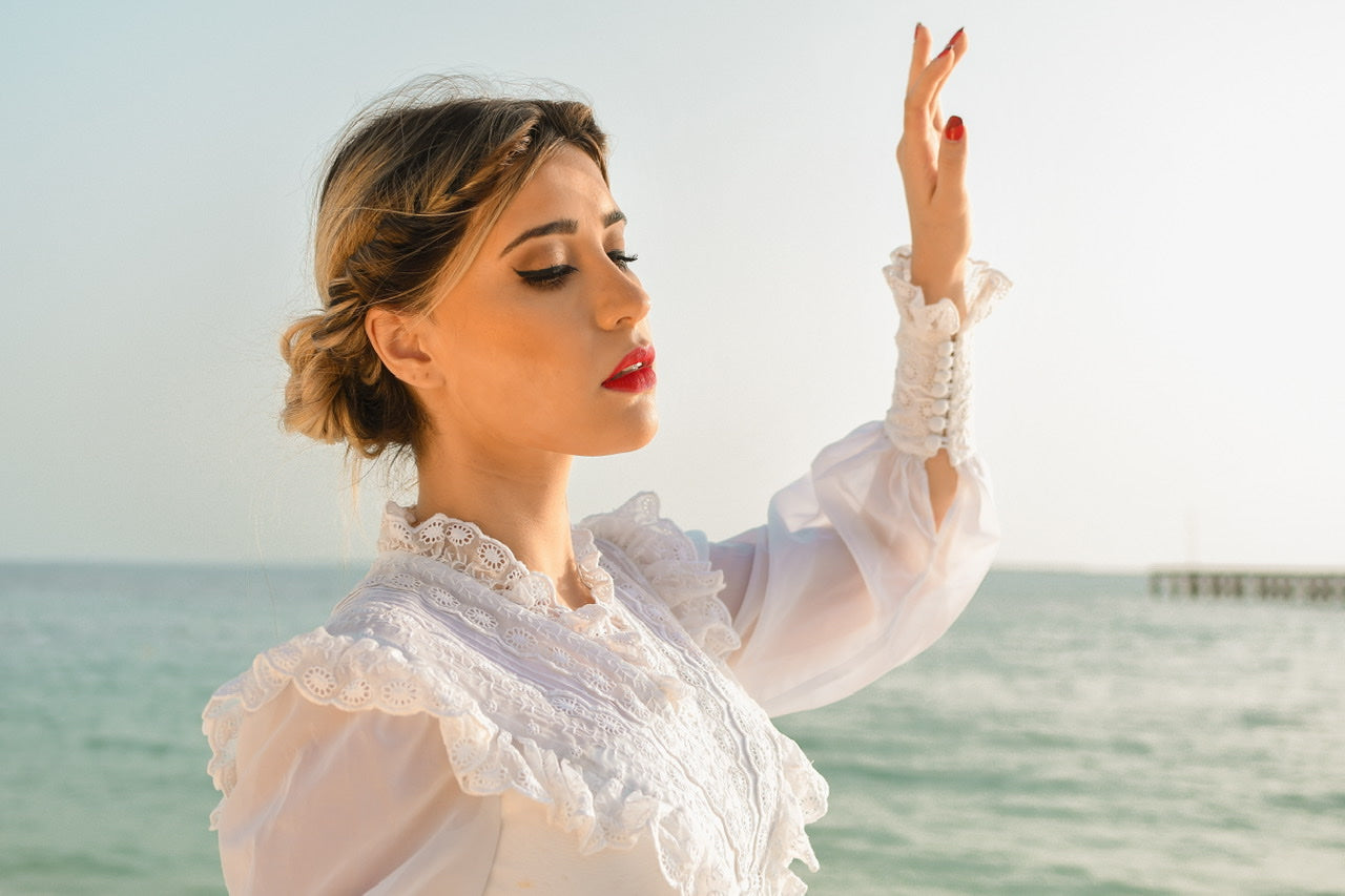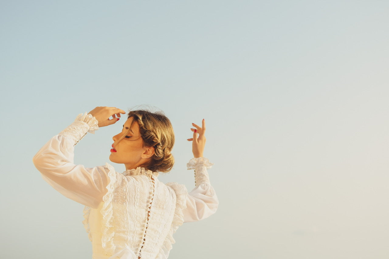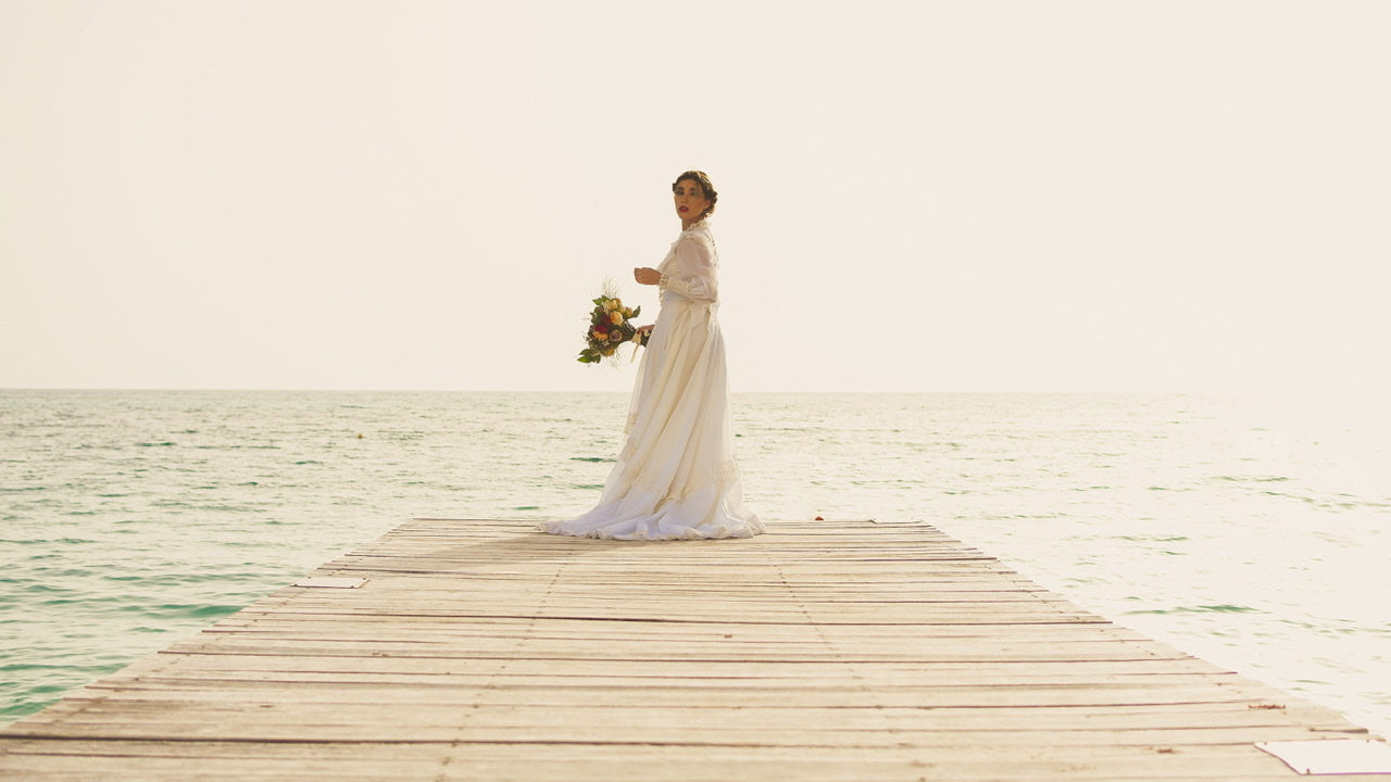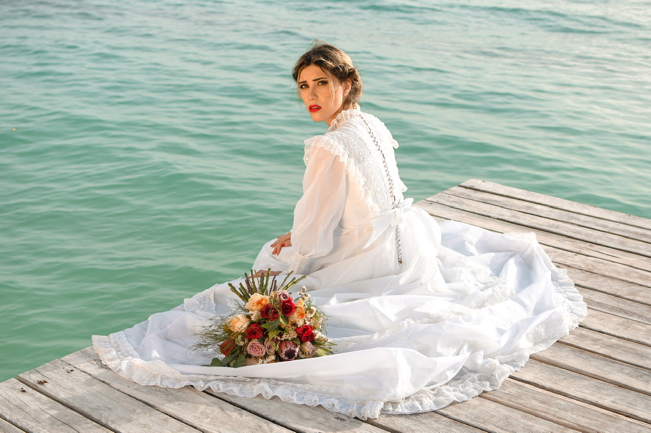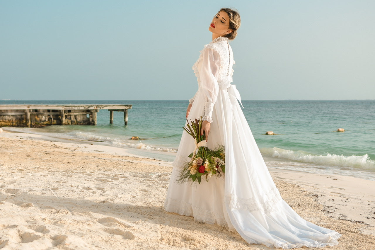 Vintage wedding dress from the early 70s, handmade in a soft ecru cream color. It features dramatic Juliette sleeves with extra-long fitted cuffs, a V-neckline with sheer fabric and a strapless bottom. It has a long ribbon at the waist (XS) to tie a bow at the back.
